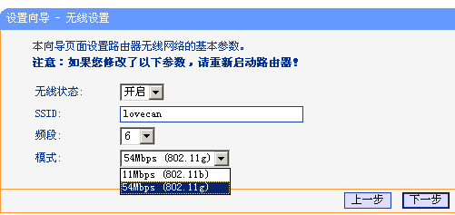 這里就有所不同了,因為是無線路由器,因此設(shè)置的時候會提示是否開啟無線路由功能。SSID隨便起,建議用英文或者英文+數(shù)字。一會要用到。頻段不用修改,模式有兩個選項(這和路由器的型號有關(guān)),其中11Mbps和54Mbps是最大傳輸速率,括號里對應的是相應的網(wǎng)絡(luò)協(xié)議。802.11即無線路由協(xié)議,b和g是協(xié)議版本號,g是b的拓展。在這里我們選54Mbps(802.11g)。單擊下一步: