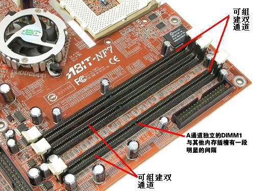 對于nForce2 雙通道主板,一般提供3個DIMM,因此僅支持1組雙通道模式。比如升技Abit-NF7有三條DIMM槽,其中DIMM1被獨立設(shè)計在一邊,而DIMM2和DIMM3則結(jié)合在一起,那么DIMM1和DIMM2可以組建一個雙通道,DIMM1和DIMM3也可以組建一個雙通道(圖2),當然三條DIMM槽同時插上也可以實現(xiàn)雙通道。
