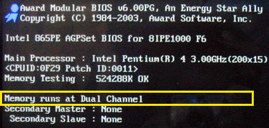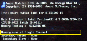 如果在開機畫面里顯示的是“Memory runs at Single Channel”或 “Dual Channel Mode Disabled”這樣的字樣(圖4),那么說明雙