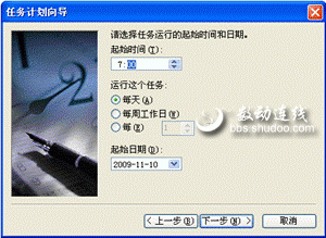 例如,我們要讓電腦在每天早晨7點(diǎn)鐘自動(dòng)啟動(dòng),并播放某一首歌曲,只要依次點(diǎn)擊“開(kāi)始→附件→系統(tǒng)工具→任務(wù)計(jì)劃”,雙擊“添加任務(wù)計(jì)劃”圖標(biāo),打開(kāi)“任務(wù)計(jì)劃向?qū)?rdquo;對(duì)話框,點(diǎn)擊“下一步”按鈕,選擇電腦中的某首MP3歌曲,點(diǎn)擊“下一步”,選擇設(shè)置“每天”執(zhí)行任務(wù),執(zhí)行時(shí)間為“7:00”(如圖所示)。