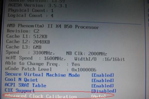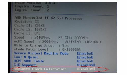 1. 開機按DEL鍵進入主板BIOS設置,找到Advanced菜單進入,再進入CPU Configuration子菜單,這時候我們可以看到AMD Phenom II X2 550處理器的相關信息,顯示的還是雙核的處理器,在頁面的底部有一個Advanced Clock Calibration菜單,這個ACC時鐘校驗是CPU高級時鐘準技術,其作用是提高CPU超頻的幅度和穩(wěn)定性,也是打開處理器被屏蔽核心的關鍵所在。進入Advanced Clock Calibration子菜單,將原默認設置Disabled修改為Auto,這樣就打開了ACC功能。