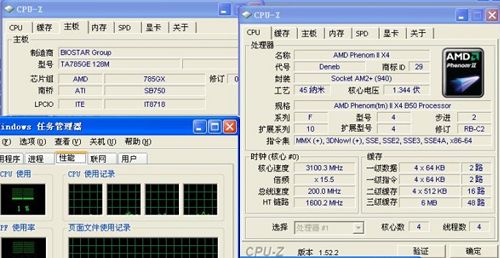 完成以上兩個步驟操作再打開BIOS,再看CPU基本信息,可以看到原來AMD Phenom II X2 550處理器已經變?yōu)锳MD Phenom(tm) II X4 B50四核處理器(如圖07)。進入Windows XP操作系統(tǒng),打開最新的CPU-Z1.52.2版,可以看到,CPU名稱已經是AMD PhenomII X4,而核心數(shù)也顯示為四核;打開系統(tǒng)任務管理器,CPU性能也很直觀地顯示四個線程都在使用中,充分證明開核成功!