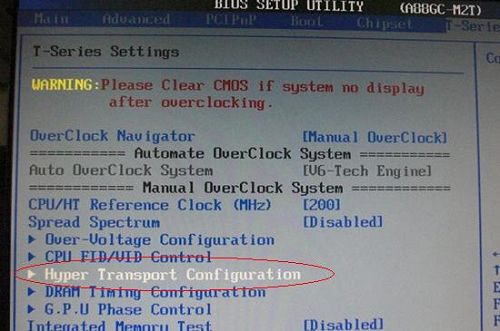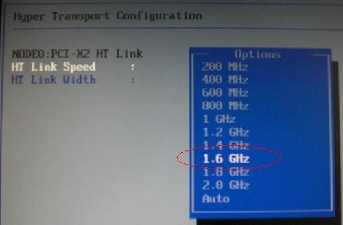 2.HT總線調整:處理器開核其實就是把被屏蔽的核心解放出來,由于不同CPU體質不一定的差異,為了穩(wěn)定起見,我們需要對HT總線進行相應的參數(shù)設置。在主板BIOS中的T-seris菜單下找到Hyper transport configuration子菜單,把HT Link Speed值直接設計為1.6GHz,為在安全和成功率方面考慮,通??刂圃?.2GHz—1.6GHz。按F10保存并退出。