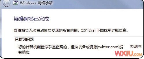輸入某個網(wǎng)站的網(wǎng)址,例如無法訪問的Twitter.com,之后軟件會自動檢查問題,稍等片刻就會給出無法訪問的具體原因。如圖所示,檢查結(jié)果是計算機配置沒有問題,只是要訪問的網(wǎng)站無法應(yīng)答。如果碰到只能上QQ不能開網(wǎng)頁之類的問題,都可以這樣處理。