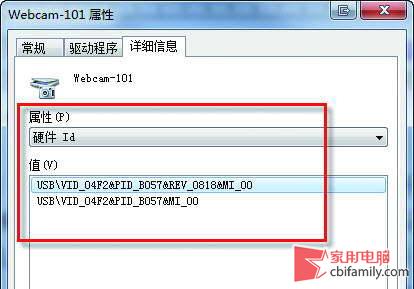在打開的窗口中,定位到“詳細(xì)信息”選項卡,通過下拉菜單找到“硬件ID”,然后就可以在下方窗格中看到諸如USBVID_174F&PID_1120&MI_00這樣的字段。記下這段字符,然后再回到第二步打開的網(wǎng)頁上面。