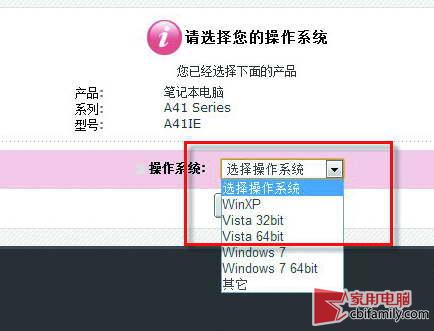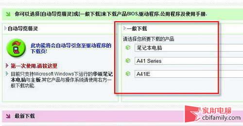在瀏覽器中打開華碩筆記本的官方網(wǎng)站,http://www.asus.com.cn/并進(jìn)入服務(wù)與支持中的下載專區(qū),然后在下載專區(qū)通過3個下拉菜單找到相應(yīng)的筆記本型號。例如選擇筆記本電腦→A41 Series→華碩A41 E。