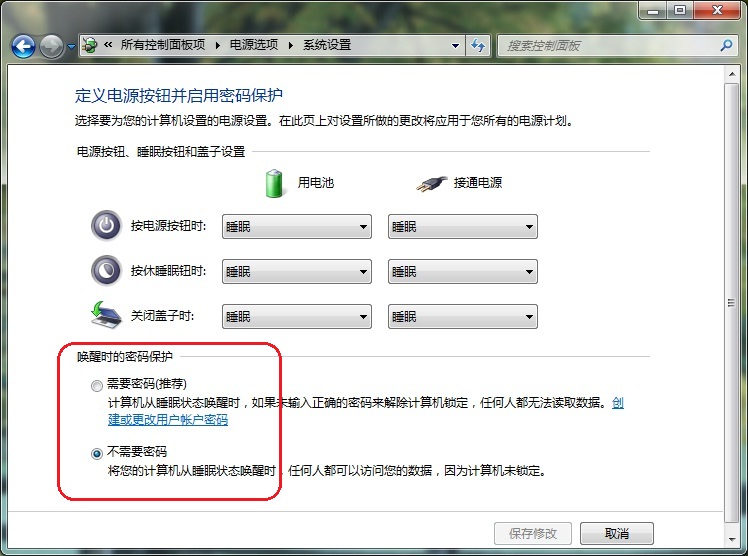 解決方案:在控制面板\\電源選項\\喚醒時需要密碼\\不需要密碼,如下圖: