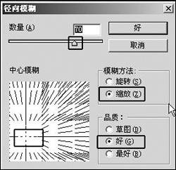 5.選取菜單命令“濾鏡→模糊→徑向模式”,彈出徑向模糊對(duì)話框,將“模糊方法”選為“縮放”,將“品質(zhì)”選為“好”,然后通過“數(shù)量”下的滑塊調(diào)整數(shù)量為“70”,用鼠標(biāo)在將“中心模糊”欄的左下方點(diǎn)一下,表示以此為點(diǎn)擴(kuò)散,具體設(shè)置如圖2。