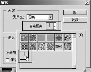 5.將圖層1作為工作圖層,按下“Ctrl+A”鍵全選工作區(qū)。選取菜單命令“編輯填充”,在“自定圖案”下列選項(xiàng)中選擇剛才定義的圖案(如圖6)。