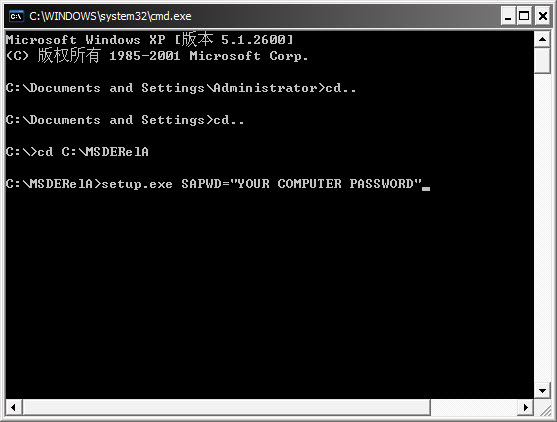 1、命令提示符下進入安裝目錄。比如MSDERelA。然后鍵入setup.exe SAPWD="YOUR COMPUTER PASSWORD".安裝成功了。如圖示: