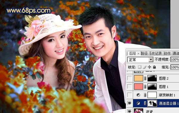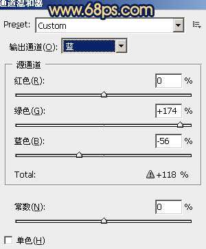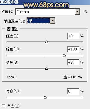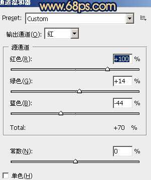 1、打開(kāi)原圖素材,創(chuàng)建通道混合器調(diào)整圖層,對(duì)紅,綠,藍(lán)進(jìn)行調(diào)整,參數(shù)設(shè)置如圖1 - 3。確定后用黑色畫筆把人物部分擦出來(lái),這一步是調(diào)整背景顏色,效果如圖4。
