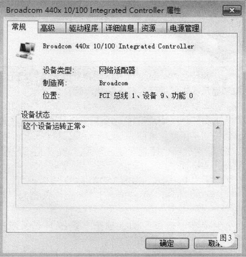 出現(xiàn)這樣的現(xiàn)象,筆者認(rèn)為不是偶然的,很可能是對應(yīng)網(wǎng)卡的網(wǎng)絡(luò)連接受到了某種故障"挾制",讓其不得已彈出虛假提示信息。首先筆者懷疑網(wǎng)卡的工作狀態(tài)存在問題,于是右擊系統(tǒng)桌面上的"網(wǎng)上鄰居"圖標(biāo),執(zhí)行右鍵菜單中的網(wǎng)絡(luò)連接列表窗口,在該窗口打開本地連接屬性對話框,單擊其中的"常規(guī)"選項卡,在該選項設(shè)置頁面中選擇目標(biāo)網(wǎng)卡,同時單擊"配置"按鈕,打開網(wǎng)卡屬性配置頁面(如圖3所示),在這里筆者看到網(wǎng)卡工作狀態(tài)很正常。