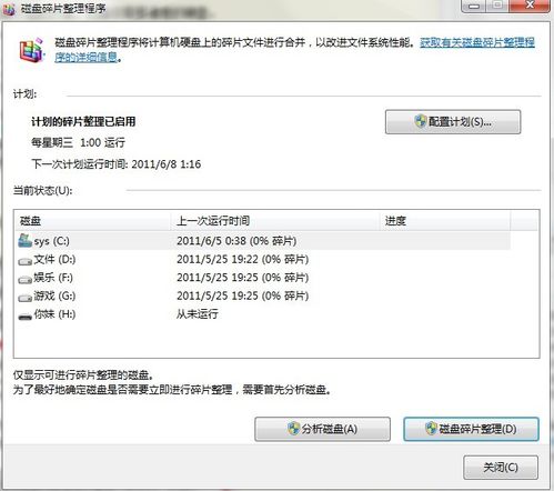 - 彈出磁盤碎片整理程序,可以看到有配置計劃,分析磁盤,碎片整理等按鈕。