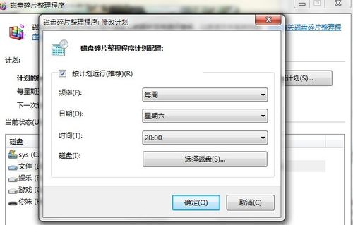 - 點擊配置計劃可以看到設(shè)置每個星期自動磁盤碎片整理(又一次見到WIN7的人性化),當(dāng)然如果你不喜歡的話可以不招待這個計劃。