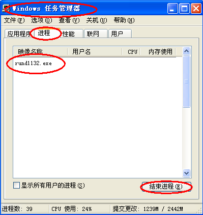 如果上面的方法無(wú)效;就嘗試同時(shí)按下組合鍵“Ctrl +Alt +Del”,會(huì)出現(xiàn)“任務(wù)管理器”的窗口,單擊“進(jìn)程”,在“映像名稱”中找尋“rund1132.exe”進(jìn)程,然后點(diǎn)擊“結(jié)束進(jìn)程”,問(wèn)是否關(guān)閉吃進(jìn)程,點(diǎn)擊“是”即可。