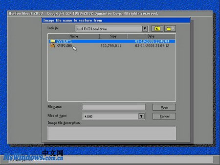 圖2010040731 單擊From Image選項(xiàng) - 第3步,在打開的“Image file name to restore from(映像文件恢復(fù))”對(duì)話框中單擊“look in(查找)”路徑框右側(cè)的下拉三角按鈕,在路徑菜單中單擊選中保存有映像文件的分區(qū)。這時(shí)會(huì)在被選中分區(qū)的列表框中列出事先備份的映像文件(本例中的文件名稱是XPSP2.GHO),單擊該映像文件,如圖2010040732所示。