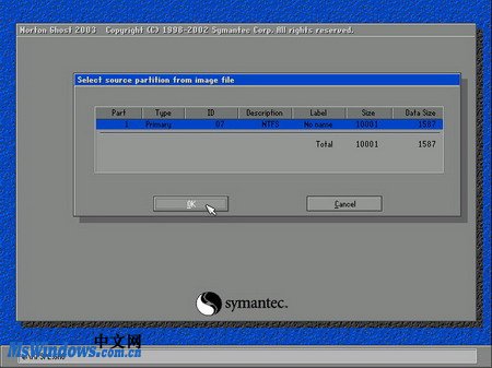 小提示:Ghost具有向后兼容的特點(diǎn),即使用較新版本的Ghost軟件能夠恢復(fù)使用較舊版本的Ghost制作的映像文件。不過在還原由較舊版本創(chuàng)建的映像時(shí),可能無法使用Ghost新版本中提供的某些功能。 - 第4步,打開“Select source partition from image file(選擇映像文件的源分區(qū))”對(duì)話框,列表中顯示出映像文件所記錄的分區(qū)信息。單擊選中該分區(qū)并單擊OK按鈕,如圖2010040733所示。