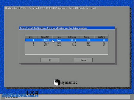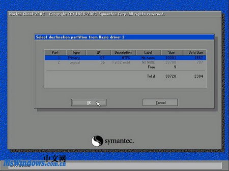小提示:如果電腦中只安裝了一塊硬盤,則直接單擊OK按鈕即可。如果安裝有多塊硬盤,則用戶需要根據(jù)硬盤驅(qū)動(dòng)器的序號(hào)和大小來確定目標(biāo)驅(qū)動(dòng)器。 - 第6步,在打開的“Select destination partition from basic drive:1(在第一個(gè)驅(qū)動(dòng)器中選擇目標(biāo)分區(qū))”對(duì)話框中選中生成映像文件的原始分區(qū)。在本例中已經(jīng)將該硬盤驅(qū)動(dòng)器的第一個(gè)分區(qū)備份成了映像文件,因此在這里仍然選擇該分區(qū)作為目標(biāo)分區(qū),并單擊OK按鈕,如圖2010040735所示。