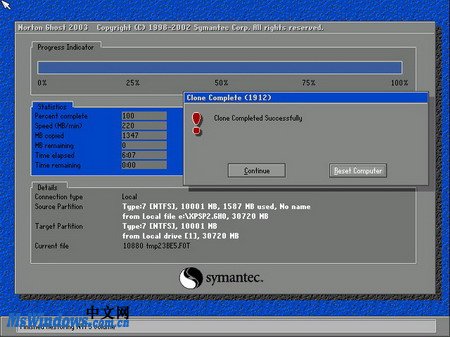 圖2010040736 確認(rèn)恢復(fù)分區(qū) - 第8步,恢復(fù)操作完成后會(huì)彈出“Clone complete(克隆完成)”提示框,用戶可以單擊“Continue(繼續(xù))”或“Reset Computer(重啟電腦)”按鈕選擇不同的后續(xù)操作,如圖2010040737所示。