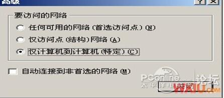 2、在彈出的小對話框中,選擇“僅計算機(jī)到計算機(jī)(特定)”,并且不要勾選“自動連接到非首選網(wǎng)絡(luò)”,否則當(dāng)附近有多個“接入點(diǎn)”時,計算機(jī)會按照首選網(wǎng)絡(luò)的排列順序自動建立連接(圖2)。