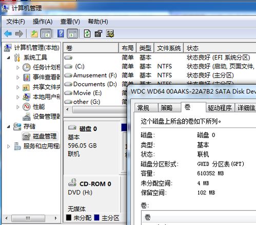 在卷選項(xiàng)卡你會(huì)發(fā)現(xiàn)磁盤風(fēng)區(qū)形式已經(jīng)成為guid分區(qū)表(GPT)而且在磁盤中只能看到efi系統(tǒng)分區(qū)呵呵