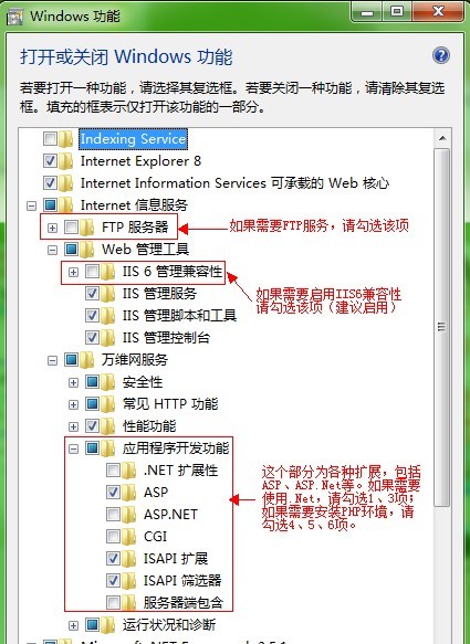 二、打開后可以看到Windows功能的界面,注意選擇的項(xiàng)目,我們按需要選擇想要的功能,下面這張圖片把需要安裝的服務(wù)都已經(jīng)選擇了,大家可以按照?qǐng)D片中的說明自行選擇開啟想要的功能。沒有說明的勾選項(xiàng)為必選項(xiàng)或默認(rèn)安裝項(xiàng)。