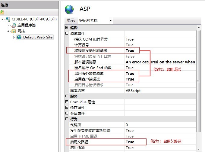 選擇計(jì)算機(jī)名(圖中為CIBILL-PC)→網(wǎng)站→Default Web Site,雙擊 ASP ,對(duì)ASP模塊進(jìn)行如下配置:(本步驟非必要操作)