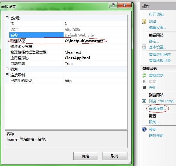4、網(wǎng)站物理路徑默認(rèn)是“C:\inetpub\wwwroot”,如需修改,請(qǐng)點(diǎn)擊右側(cè)的“高級(jí)設(shè)置...”進(jìn)行配置。