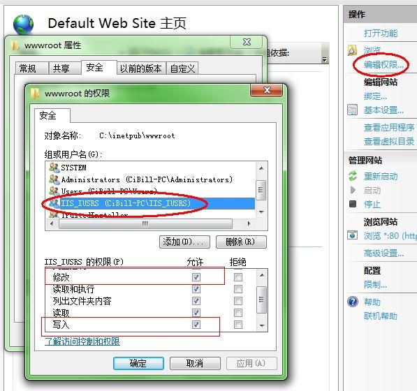 5、接著,為網(wǎng)站物理路徑設(shè)定IIS匿名用戶的讀寫權(quán)限。點(diǎn)擊右側(cè)的“編輯權(quán)限...”,為網(wǎng)站目錄增加IIS_USERS用戶組的讀寫權(quán)限。(注:這是最關(guān)鍵的步驟,很多朋友安裝后訪問Access數(shù)據(jù)庫出錯(cuò)就是因?yàn)橥俗鲞@一步。因此,每次修改網(wǎng)站物理路徑或增加虛擬目錄之后,別忘了對(duì)這些目錄增加相應(yīng)的IIS_USERS用戶組權(quán)限)