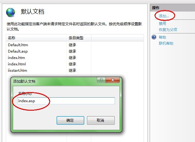 6、雙擊“默認(rèn)文檔”,添加index.asp。