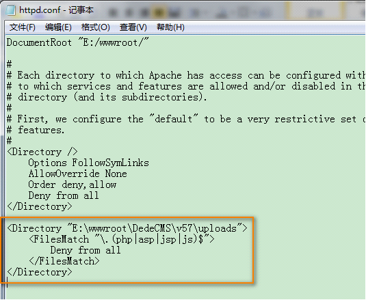 配置內容中的DIR為需要限制執(zhí)行腳本文件的目錄,F(xiàn)ilesMatch后的內容為需要限定的執(zhí)行的腳本后綴名。例如:這里需要禁止測試站點uploads文件夾下的PHP,ASP,JSP腳本的運行,則進行如下圖6配置: