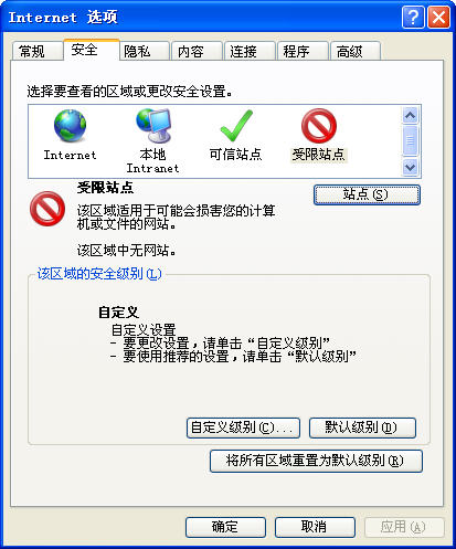 其他的一些網(wǎng)站碰到很多XX,可以首看一下你是不是有將該站點設(shè)為限制站點,可以到“工具”-“Internet選項”-“安全”選項卡中選擇“受限站點”然后點擊“站點”按鈕,如果該網(wǎng)站不再這個列表里,說明不是瀏覽器的事情了。如果你有防火墻,可以暫時關(guān)閉一下,看看效果。再不行,換其他的瀏覽器,如火狐,遨游等試試看,如果都不能解決這個問題,那很可能是你的網(wǎng)絡(luò)提供商的問題了,需要你咨詢一下他們了。