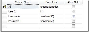 CREATE TABLE [dbo].[Users]( [Id] [uniqueidentifier] NOT NULL, [UserId] [int] NOT NULL, [UserName] [varchar](50) NULL, [Password] [varchar](50) NOT NULL, CONSTRAINT [PK_Users] PRIMARY KEY CLUSTERED ( [Id] ASC )WITH (PAD_INDEX = OFF, STATISTICS_NORECOMPUTE = OFF, IGNORE_DUP_KEY = OFF, ALLOW_ROW_LOCKS = ON, ALLOW_PAGE_LOCKS = ON) ON [PRIMARY] ) ON [PRIMARY]
