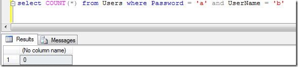 select COUNT(*) from Users where Password = 'a' and UserName = 'b'