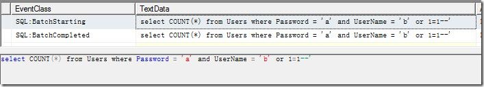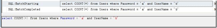 exec sp_executesql N'select COUNT(*) from Users where Password = @Password and UserName = @UserName',N'@Password varchar(1),@UserName varchar(1)',@Password='a',@UserName='b'