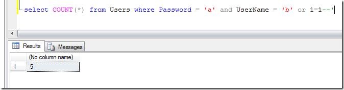 select COUNT(*) from Users where Password = 'a' and UserName = 'b' or 1=1—'