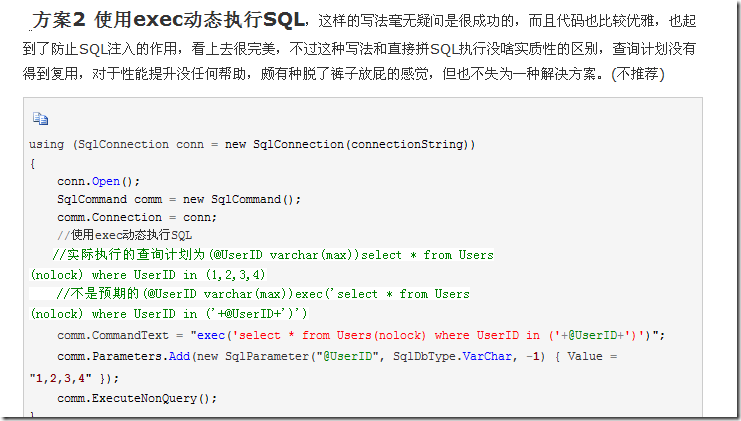 private static void TestMethod() { using (SqlConnection conn = new SqlConnection(connectionString)) { conn.Open(); SqlCommand comm = new SqlCommand(); comm.Connection = conn; //使用exec動(dòng)態(tài)執(zhí)行SQL //實(shí)際執(zhí)行的查詢(xún)計(jì)劃為(@UserID varchar(max))select * from Users(nolock) where UserID in (1,2,3,4) //不是預(yù)期的(@UserID varchar(max))exec('select * from Users(nolock) where UserID in ('+@UserID+')') comm.CommandText = "exec('select * from Users(nolock) where UserID in ('+@UserID+')')"; comm.Parameters.Add(new SqlParameter("@UserID", SqlDbType.VarChar, -1) { Value = "1,2,3,4" }); //comm.Parameters.Add(new SqlParameter("@UserID", SqlDbType.VarChar, -1) { Value = "1,2,3,4); delete from Users;--" }); comm.ExecuteNonQuery();
