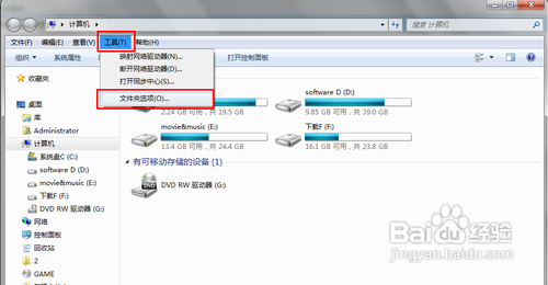 打開(kāi)“我的電腦”,在菜單欄上選擇“工具”,在下拉菜單選擇“文件夾選項(xiàng)”