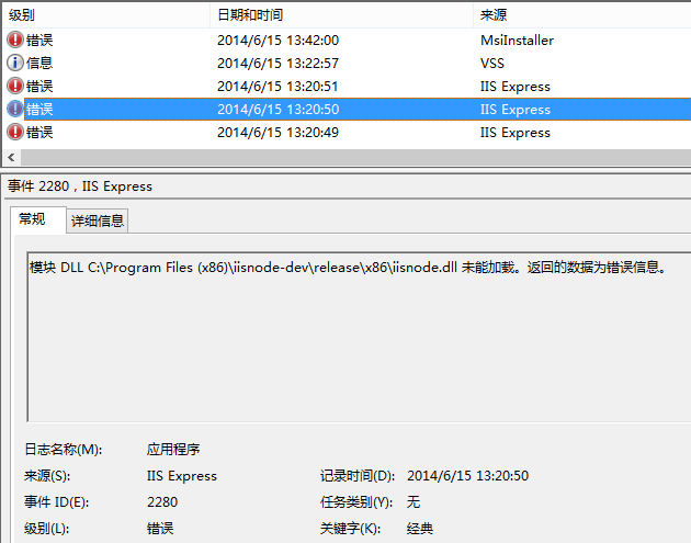 問題焦點已經(jīng)很清楚了,就是IIS Express未能啟動。于是想到查看事件,看有沒有記錄更具體的日志。