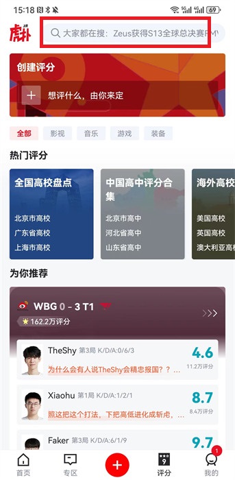 2、在評分界面中點擊上方的【搜索框】,然后去進(jìn)行搜索;