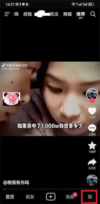 1、打開我們的抖音app,在軟件的首頁界面視頻播放界面中點擊右下角的【我】進入到個人主頁界面;