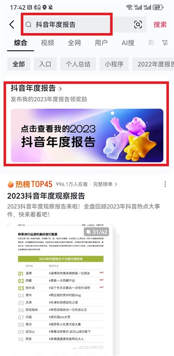 1、在都抖音中搜索【抖音年度報(bào)告】在搜索之后就會(huì)出現(xiàn)結(jié)果,在呈現(xiàn)的結(jié)果頁(yè)面,點(diǎn)擊下方的海報(bào);