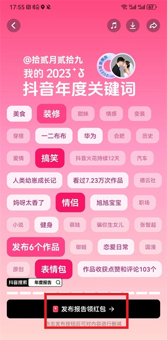 5、查看完之后,如果想要發(fā)布成為自己的視頻作品,可以選擇點(diǎn)擊【發(fā)布報(bào)告領(lǐng)紅包】,經(jīng)過(guò)你的刪改之后才會(huì)發(fā)布,保留我們今年的記憶。