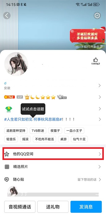 3、在對(duì)方的資料界面中,點(diǎn)擊對(duì)方的【空間】,就可以進(jìn)入到空間動(dòng)態(tài)中;