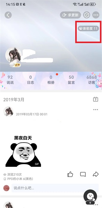 4、最后在空間動(dòng)態(tài)界面的右上角就可以看到【親密度】。