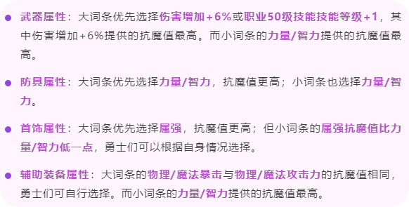下面來看看全身各部位最高抗魔值詞條,抗魔值最高、但并不代表傷害最高,下面會介紹:1、武器屬性大詞條推薦:百分之六傷害加67抗魔值,50技能加48抗魔值小詞條推薦:力智加32抗魔值,物攻魔攻加24抗魔值