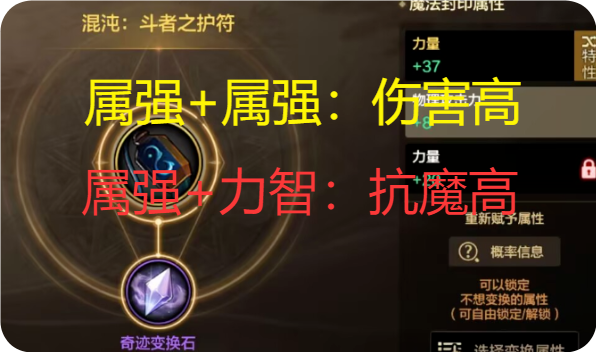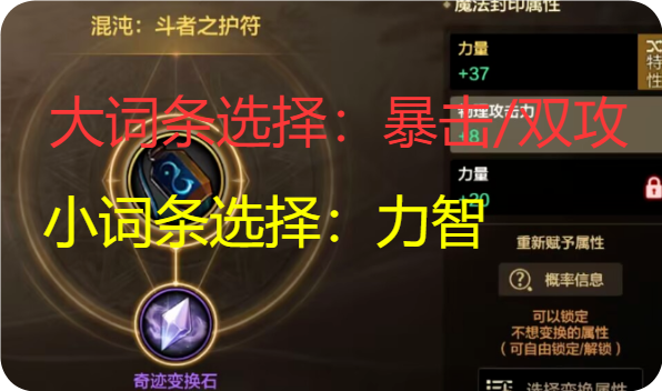 這里最大的爭議點出來了,首飾大詞條選擇屬強毫無問題,但小詞條的屬強抗魔值比力智低,2個詞條就少了6點。追求傷害肯定選擇屬強,強行堆疊抗魔值可以選擇力智。4、輔助裝備屬性大詞條推薦:暴擊加34抗魔值,雙攻加34抗魔值小詞條推薦:力智加33抗魔值,暴擊加14抗魔值
