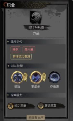 4、了解隱衛(wèi)技能特點(diǎn),隱衛(wèi)擁有誘敵羅煙步奪魂鏢等技能定位為控制目標(biāo)并輸出解鎖轉(zhuǎn)職后還能獲得專精技能天影和殘像可提升攻擊速度與效果。