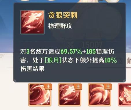 2、貪狼突刺能對(duì)三個(gè)敵方目標(biāo)造成物理傷害,若處于狼月?tīng)顟B(tài)下還有10%額外傷害加成,可在群體輸出時(shí)發(fā)揮更強(qiáng)威力,有效壓制敵方血線。