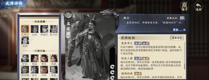 代號殺的策略對戰(zhàn)世界里,武將牌孟嘗君憑借獨(dú)特技能成為玩家關(guān)注焦點(diǎn),作為合縱連橫擴(kuò)展包的一員,孟嘗君三個技能兼具控制、防御與增益效果,雖然機(jī)制略顯復(fù)雜,但掌握使用要點(diǎn)后,能在對戰(zhàn)中發(fā)揮強(qiáng)大作用,無論是抵御敵方攻勢,還是助力己方隊(duì)友,孟嘗君都有出色表現(xiàn),接下來將從技能解析、實(shí)戰(zhàn)運(yùn)用等方面,詳細(xì)介紹孟嘗君的玩法攻略。